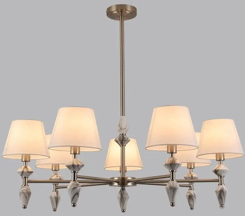 Подвесная люстра Lumion Vermont 8274/7 создает мягкий и равномерный свет в комнате. Она оснащена семьёй ламп с цоколем E14 и мощностью по 40 Вт каждая, что позволяет хорошо освещать пространство. Люстра имеет классический дизайн с белыми текстильными плафонами и серебристым каркасом, что легко впишется в разные интерьеры. Крепится к потолку на планке, длина составляет 90 см, ширина — 90 см, а высота — 78 см. Вес конструкции 3,55 кг, что облегчает монтаж. В люстре отсутствует встроенная подсветка и регулировки яркости или цвета, поэтому свет получается постоянным. Она не включает в себя встроенные светодиоды и не управляется дистанционным пультом или через умный дом. Главной ее особенностью является классический стиль и надежные материалы — керамика, металл и текстиль. Это устройство отлично подойдет для гостиной или столовой, создавая уютную атмосферу.