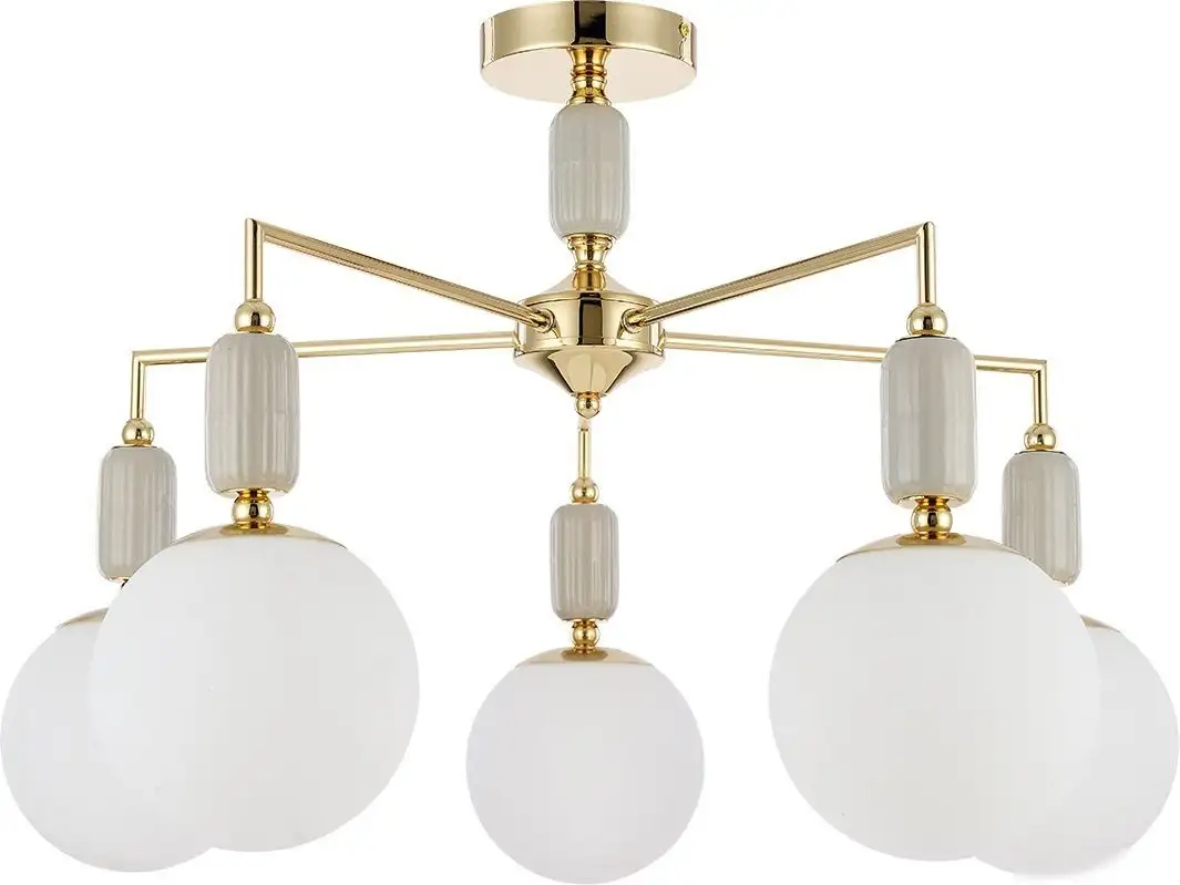 Эта потолочная люстра Lumion Vivien 6580/5C отлично подойдет для современного интерьера. Она имеет пять ламп мощностью по 20 Вт каждая, обеспечивая яркий и равномерный свет. Люстра выполнена из керамики, металла и стекла, что придает ей прочность и стильный вид. Белые плафоны создают мягкое освещение, а золотистый каркас украшается элегантным дизайном. Размеры люстры — 69 на 69 см, она легко закрепляется на потолке с помощью планки. Вес изделия составляет 2.54 кг, что обеспечивает удобство монтажа. Люстра не оборудована дистанционным управлением и поворотными лампами, что делает ее простым в использовании. Цоколь — E14, лампочки в комплекте не идут. Эта модель отлично впишется в современный дизайн помещения, создавая уют и стиль.