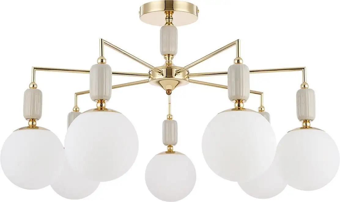 Люстра Lumion Vivien 6580/7C — современное потолочное освещение, которое хорошо подходит для любой комнаты. Она оснащена семью лампами мощностью 28 Вт каждая, что обеспечивает яркий свет. Каркас сделан из металла и керамики в золотистом цвете, а плафоны выполнены из стекла в белом оттенке, создавая стильный и элегантный вид. Размер люстры — 81 см в длину и ширину, а высота — 47 см, что подходит для разных потолков. Люстра не включает лампочки в комплекте, и к сожалению, нет функции дистанционного управления. Монтаж производится на планку, а крепление — на потолок. Вес изделия — 3,61 кг, что легко монтировать и переносить. Это изделие отлично подходит для тех, кто ищет современную люстру с хорошей яркостью и стильным дизайном.