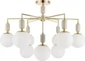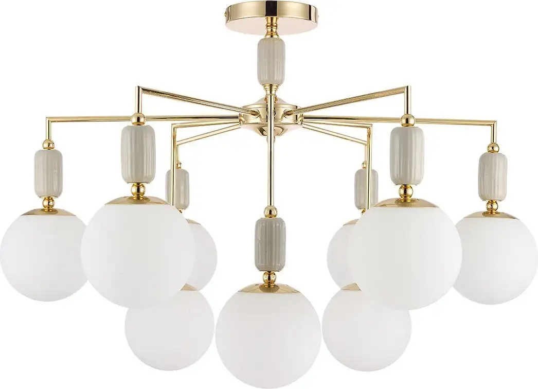Люстра Lumion Vivien 6580/9C — современное потолочное освещение с девятью лампами мощностью 36 Вт каждая. Она имеет белые плафоны из стекла и золотистый каркас, что создаёт стильный и теплый внешний вид. Люстра длиной и шириной 86 см хорошо подходит для светлого и просторного интерьера. Высота изделия составляет 59 см, а вес — 4.27 кг, что обеспечивает надёжную закрепляемость. Каркас выполнен из керамики и металла, что гарантирует долговечность и надежность. В комплекте лампочки не идут, необходимо приобретать отдельно, а цоколь — E14. Крепление осуществляется на планку, без функции поворота и дистанционного управления. Эта модель отлично подходит для комфортабельного освещения комнат в современном стиле.