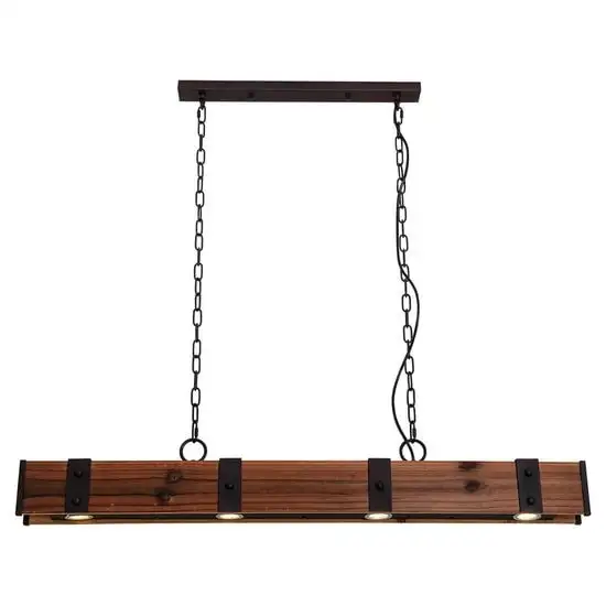 Подвесная люстра Lussole Loft LSP-9860 отлично подходит для современных интерьеров. Она оснащена четырьмя лампами мощностью 3 Вт с цоколем GU10, которые обеспечивают яркое освещение. Люстра имеет черный металлический каркас и коричневые деревянные плафоны, создавая стильный и тёплый вид. Благодаря регулируемой высоте вы можете легко настроить нужный уровень освещения и расположение. Установка происходит на потолке с помощью планки, длиной 110 см и шириной 8 см. Люстра не имеет пульта или регулировки яркости, что упрощает её использование. Она обеспечивает качественный свет без дополнительных функций, направленных на управление или сенсорные системы.