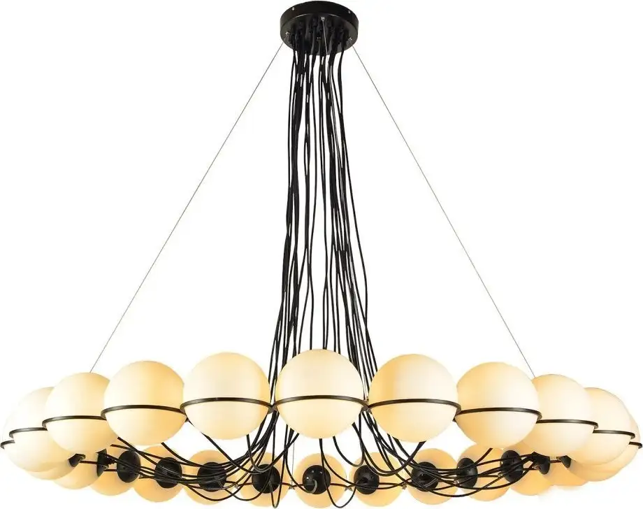 Подвесная люстра Lussole Seneca GRLSP-8176 отлично подходит для освещения больших помещений. Она оснащена 24 белыми плафонами, которые создают яркое и равномерное освещение. Каркас выполнен из прочного металла черного цвета, а плафоны — из стекла, что делает дизайн современным и стильным. Люстра мощностью 240 Вт хорошо освещает просторные комнаты или офисы. Она не имеет встроенных светодиодов или регулируемых функций, но легко устанавливается благодаря проводу с вилкой и выключателю. Ваша комната будет хорошо освещена даже без дистанционного управления или подключения к "умному дому". Люстра не поворотная и не регулируется по яркости или цвету, что подходит для тех, кто ищет простое решение. Ее размеры — ширина 137 см и высота 180 см — позволяют разместить ее в просторных помещениях. Благодаря качественным материалам, она прослужит долго и сохраняет современный внешний вид.