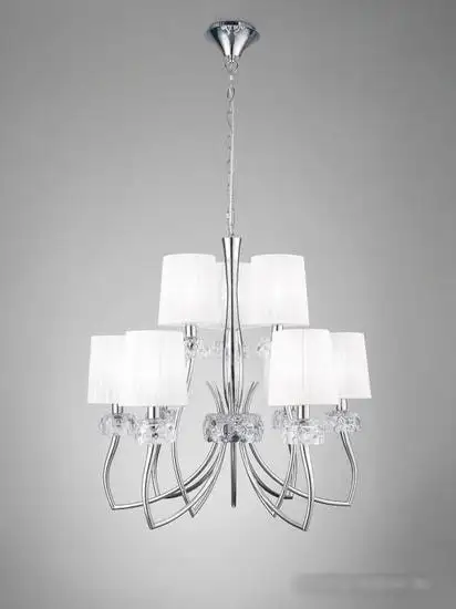 Подвесная люстра Mantra 4630 станет ярким акцентом в любом помещении. Она имеет 9 ламп мощностью по 13 Вт, что обеспечивает достаточное освещение. Плафоны выполнены в бежевом цвете, а каркас — из хрома, что создает современный и элегантный внешний вид. Люстра крепится на крюк и не регулируется по высоте, поэтому выбирайте подходящую комнату заранее. В комплект входит ламочка, но выключателя и регулировки яркости нет. Благодаря металлическому каркасу и текстильным плафонам она сочетает прочность и стиль. Обратите внимание, что эта модель не оснащена функциями регулировки яркости или поворотными лампами. Она отлично подойдет для гостиной, спальни или столовой. Простая установка и современный дизайн делают её удобным решением для домашних интерьеров.