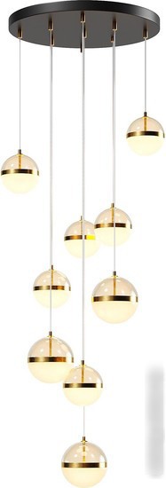 Подвесная люстра Maytoni Area MOD295PL-L120BBS3K имеет черную потолочную чашу с антибликовым покрытием sandy и декоративными металлическими плафонами цвета сатинированной латуни. В ней используются две фактурных стеклянных части: матовая белая низ и тонированное янтарное верхнее, что создает мягкое рассеянное освещение. Внутри установлен LED-модуль, который равномерно освещает помещение и направляет свет вверх и вниз. Световая температура составляет 3000K, а угол рассеивания — 120 градусов, что обеспечивает приятный теплый свет и широкий охват. Люстра оснащена девятью лампами с общей мощностью 120 Вт и светодиодами в комплекте. Вы можете регулировать яркость для создания нужной атмосферы. Каркас выполнен из металла, а плафоны — из стекла, что придает современный стиль. Размер люстры — 58х58 см, высота — 368.5 см, а вес 10.1 кг позволяет легко её монтировать. Эта люстра отлично подойдет для больших помещений и создаст уютную атмосферу.