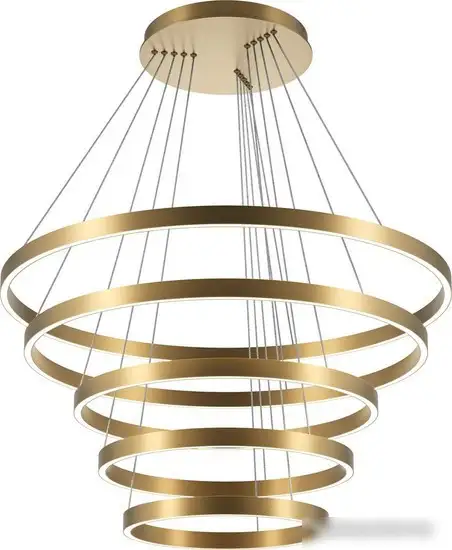 Эта подвесная люстра Maytoni Rim выполнена из алюминия и латунь, имеет современный дизайн в форме окружности и шириной 90 см. Она оснащена одним светодиодным источником мощностью 173 Вт, который обеспечивает яркость 5300 лм и регулируемую цветовую температуру от 2600 до 3500 К. Устройство легко монтируется и позволяет регулировать яркость и цвет через встроенный диммер. Коленья подвесных элементов можно настроить по желанию, что добавляет гибкости при установке. Светильник направляет свет на стену благодаря встроенному бра, что создает трендовую отраженную подсветку. Благодаря интегрированным LED-лампочкам, он не требует замены батареек и обеспечивает долговечную работу. Высота люстры достигает 300 см, а вес составляет 7,1 кг, что обеспечивает стабильность и надежность. Люстра не имеет поворотных ламп или повышенной влагозащищенности, что лучше учитывать при установке.