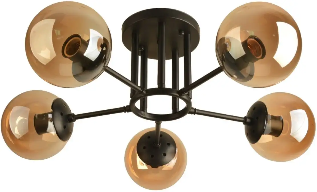 Люстра Mirastyle BL-8256/5 BK — это светильник средней высоты, устанавливаемый на потолок. Она оснащена пятью лампами с цоколем E27, каждая мощностью 200 Вт, что позволяет ярко освещать комнату. Каркас выполнен из металла черного цвета, а плафоны сделаны из стекла коричневого оттенка, создавая современный стиль. Размер люстры — 55 см в длину и ширину, а высота составляет 30 см. Оборудована планкой крепления для надежной фиксации. Вес устройства — 1,8 кг, оно легко монтируется на потолок. Люстра не имеет функции регулировки яркости и дистанционного управления, но надежно освещает пространство. Поворотных ламп и встроенных регулируемых элементов в конструкции нет, что обеспечивает простоту эксплуатации. Такой светильник — хороший выбор для современных интерьеров, нуждающихся в ярком освещении.