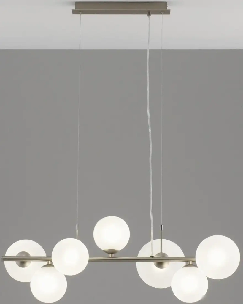 Подвесная люстра Moderli Renny V11467-7P создает уют в вашем доме благодаря своему современному стилю и лаконичному дизайну. Она оснащена семью лампочками с мощностью 35 Вт каждая, которые подходят как для ламп накаливания, так и для LED-ламп. Металлический каркас серебристого цвета и белые сферические плафоны делают светильник универсальным и легко вписывающимся в любой интерьер. Регулируемая по высоте монтажная планка позволяет установить светильник максимально удобно для комнаты. В плафонах есть отверстия для отвода тепла, что обеспечивает безопасность и долговечность использования. Светильник не оснащён встроенной подсветкой или функцией диммирования, но он отлично подходит для общего освещения. Использование этого светильника подчеркивает стиль и добавляет светлый, приятный свет. Его легко установить на потолок в кухне, холле или гостиной для создания комфортной атмосферы.