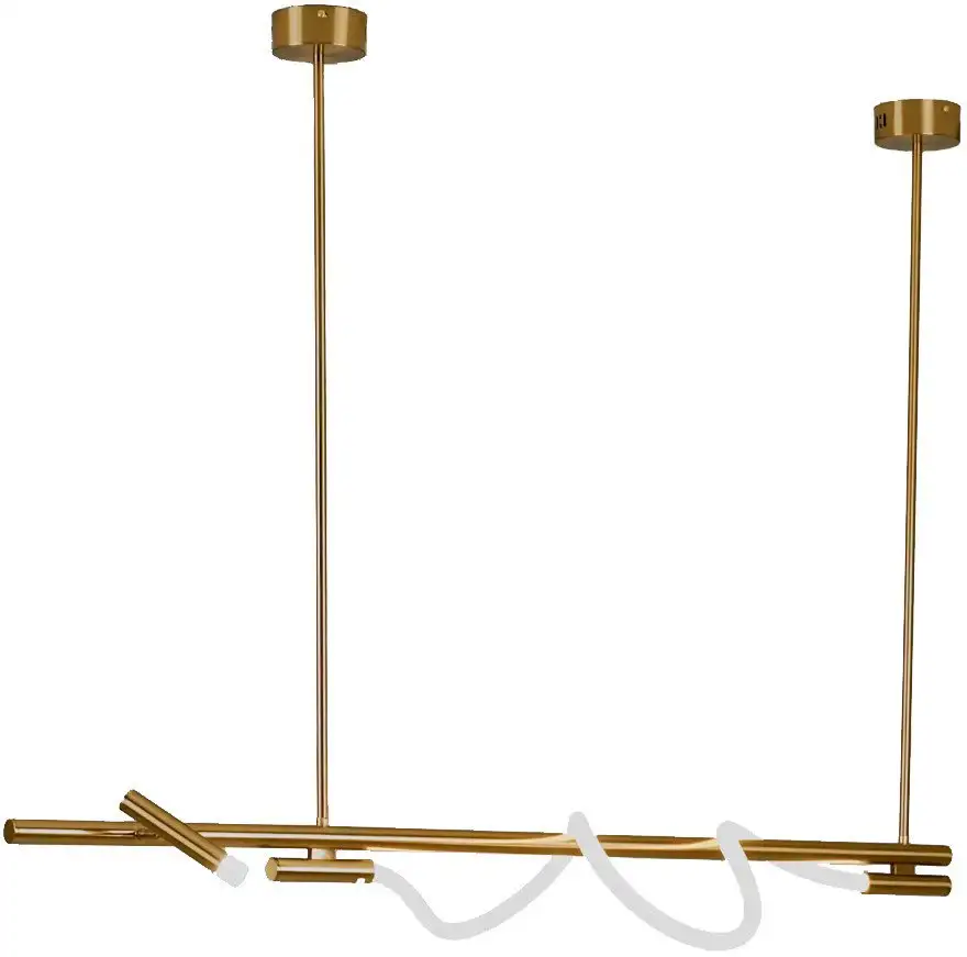 Подвесная люстра Moderli True V10684-PL создаёт приятное и мягкое освещение благодаря встроенной светодиодной ленте мощностью 18 Вт. Она выполнена из металлического золотого каркаса и белых плафонов из силикона, что добавляет уют и стиль вашему интерьеру. Люстра длиной 120 см подходит для освещения площади до 12 м² и хорошо вписывается в современный дизайн. Светильник плавно обвивает корпус, создавая воздушный и уникальный образ. Благодаря длительной светодиодной подсветке она экономит электроэнергию и не требует частой замены ламп. Передача яркости отсутствует, но яркость 1934 лм обеспечит яркое равномерное освещение. Простая установка возможна благодаря монтажной планке, а вес 3.4 кг делает конструкцию лёгкой и устойчивой. Элегантный дизайн и качественные материалы делают эту люстру практичным выбором.