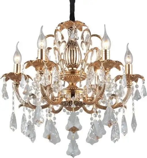 Подвесная люстра Omnilux OML-77723-06 отлично подойдет для создания уютной атмосферы в комнате. Она имеет шесть ламп мощностью по 60 Вт, которые обеспечивают яркий свет — 3780 люмен. Каркас выполнен из прочного металла с красивым золотистым покрытием, а плафоны из прозрачного хрусталя добавляют изысканности. Люстра крепится на крюке, что облегчает установку, а длина 61 см и высота 80 см делают ее подходящей для разных помещений. Цвет плафонов позволяет сочетать ее с разными стилями интерьера. Не имеет функции регулировки яркости и поворотных ламп, но обеспечивает стабильное освещение без дополнительных настроек. Она легкая — весит всего 6,5 кг, что упрощает монтаж. Такая люстра отлично подходит для гостиных, столовых или прихожих. Она не имеет встроенной подсветки или датчиков, а управление светом осуществляется стандартными лампочками в комплекте.