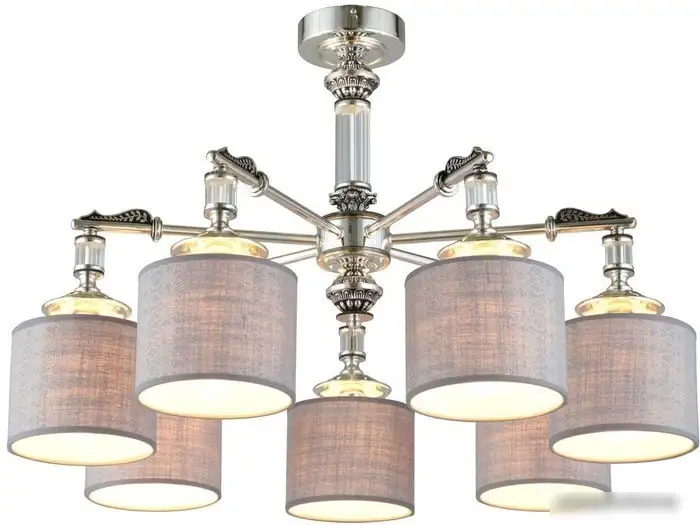 Люстра Omnilux Rovigo OML-64317-07 — это средняя по высоте потолочная модель с 7 лампами мощностью 40 Вт каждая. Она создаёт яркий световой поток 2940 лм, что идеально подходит для освещения комнат. Каркас выполнен из металла с хромовым покрытием, а плафоны — из серого текстиля, указывая на современный дизайн. Высота люстры составляет 50 см, а вес — 4,72 кг, что делает её устойчивой и лёгкой в установке. Люстра не имеет поворотных ламп или датчиков движения, что обеспечивает стабильность работы. Монтаж осуществляется планкой, в комплект входят схема сборки и крепежные элементы. Благодаря классическому дизайну она украшает любую комнату, при этом остаётся практичной. Отсутствие встроенных ламп в комплект позволяет выбрать любые лампы по желанию. Эта люстра отлично подходит для тех, кто ищет надёжное и красивое освещение в современном стиле.