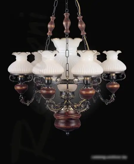 люстра средней высоты, плафон белый (стекло), каркас коричневый