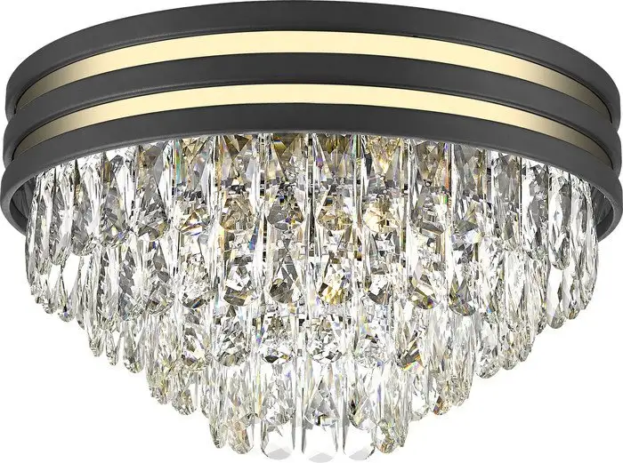 Эта люстра средней высоты подойдет для потолка в комнате. Она располагается прямо у потолка и оснащена тремя плафонами, каждый из которых принимает лампы мощностью до 40 Вт. В комплект лампы не входят, поэтому вы можете выбрать подходящий светильник по своему вкусу. Люстра имеет современный дизайн с черным каркасом и прозрачными или золотистыми плафонами из металла и хрусталя. Благодаря планке крепления она надежно держится на потолке. Размеры люстры: длина и ширина — 46 см, высота — 27 см, вес — 10.1 кг. Важной особенностью является надежность и долговечность материалов: металл и хрусталь. Эта люстра отлично подойдет для гостиной или спальни, создавая приятное освещение. Также она легко монтируется и украсят любой современный интерьер.