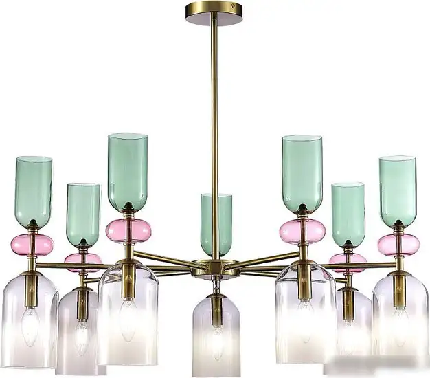 люстра средней высоты, плафон дымчатый/зеленый (стекло), каркас золотистый