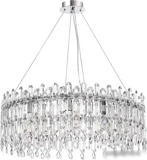 Подвесная люстра Stilfort Legacy 2158/09/12P удобно регулируется по высоте, что помогает быстро подобрать нужный уровень освещения. Она оснащена 12 лампами мощностью по 40 Вт каждая, что создаёт яркий свет для просторных помещений. Люстра имеет современный дизайн с прозрачными плафонами из хрусталя и хромированным каркасом из металла. В ней используется цоколь E14, что позволяет легко менять лампочки. Размеры люстры — 80 см в длину и ширину, а высота регулируется до 60 см, что помогает отлично вписаться в кухню или гостиную. Крепление осуществляется на планку, что обеспечивает надёжность и устойчивость. Благодаря металлу в каркасе и хрустальным плафонам, конструкция выглядит стильно и современно. В комплектацию лампочки не входят, поэтому их нужно покупать отдельно. Эта люстра отлично подходит для тех, кто ищет яркое и современное освещение для большой комнаты.
