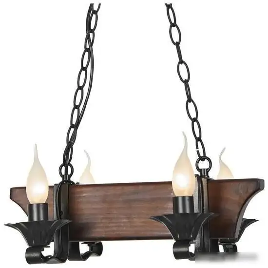 Подвесная люстра Velante 598-703-04 отлично подходит для надёжного освещения вашей комнаты. Она оснащена четырьмя лампами мощностью по 40 Вт, которые обеспечивают яркое освещение. Каркас выполнен из дерева и металла, что придаёт ей прочность и стильный внешний вид. Размеры плафона: длина 41 см и ширина 32 см, высота — 96 см, что позволяет удобно разместить её в любой комнате. Люстра цепляется к потолку без необходимости в регулировке высоты. Она не имеет датчика движения и не подключается к умной системе, что делает её понятной в использовании. Каркас окрашен в коричневый и черный цвета, что легко сочетается с разными интерьерами. В комплект лампочки и выключатель не входят, их нужно приобретать отдельно. Эта люстра проста в монтаже и долговечна благодаря использованным материалам.