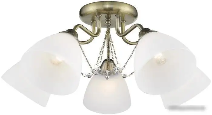Припотолочная люстра Velante 727-507-05 отлично подойдет для освещения комнаты. Она имеет пять ламп с цоколем E27 и мощностью по 60 Вт каждая, что обеспечивает яркое освещение. Каркас выполнен из прочного металла с бронзовой отделкой, а плафоны сделаны из стекла и окрашены в белый цвет. Люстра фиксирована по высоте, её ширина — 58 см, а высота — 24,5 см. Устройство не использует умные функции и не оснащено выключателем. Эта модель не подходит для влажных помещений и установлена без регулировки высоты. Благодаря простому дизайну она легко впишется в разные комнаты. Высокая надежность обеспечивает долговечность ее работы. Такое освещение лучше всего подходит для жилых помещений, дающих яркий свет без лишних функций.