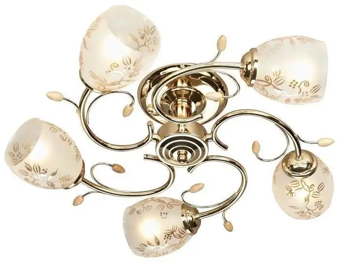 Эта потолочная люстра Velante 762-307-05 идеально подойдет для любого помещения. Она оснащена пятью лампами мощностью 40 Вт каждая, которые обеспечивают яркое освещение. Каркас выполнен из металла с красивым золотистым цветом, а плафоны сделаны из стекла и имеют белый цвет. Размер люстры — шириной 52 см и высотой 15 см, что делает её удобной для монтажа в стандартные помещения. Не имеет включателя и регулируемой высоты, поэтому подключается напрямую к электросети. Нет функции умной лампы или датчика движения, а лампочки в комплект не входят. Люстра не обладает повышенной влагозащищённостью и подходит для общего освещения. Она проста в установке и долговечна благодаря качественным материалам.