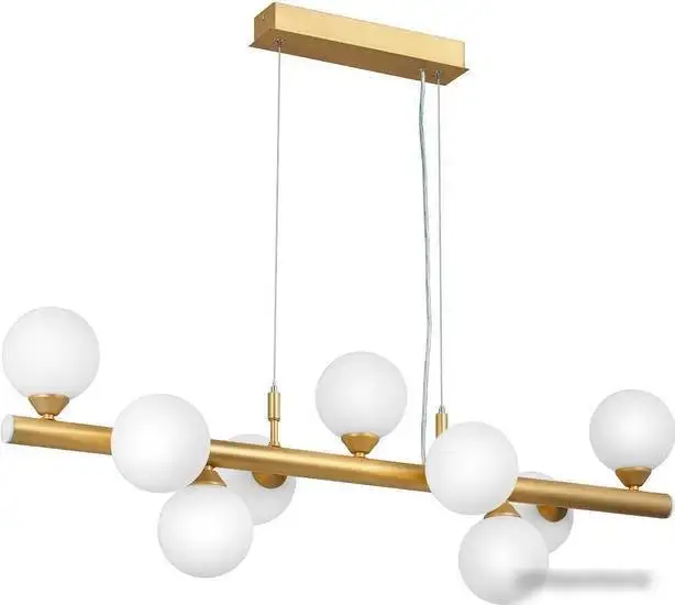 Эта подвесная люстра Vitaluce V4986 с современным дизайном отлично дополнит любой интерьер. Она оснащена девятью лампами с мощностью 252 Вт, что обеспечивает хорошее освещение комнаты. Люстра имеет металлический желтый каркас и белые стеклянные плафоны, создавая яркое и свежие световые акценты. Благодаря длине 99 см и высоте 108 см она подходит для просторных помещений. Люстра крепится на планку, что облегчает установку. Используйте цоколь G9 для быстрой замены ламп. Эта модель не обладает влагозащищенностью, поэтому размещайте ее в сухих зонах. Материалы – металл и стекло, что обеспечивает надежность и долговечность.
