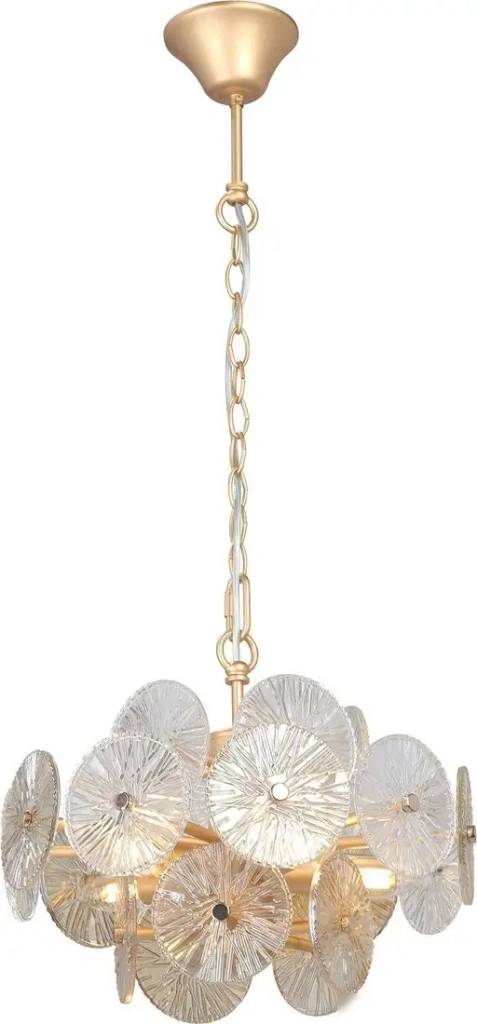 - Золотистый каркас и прозрачные плафоны создают стильный внешний вид — подчеркнут интерьер.