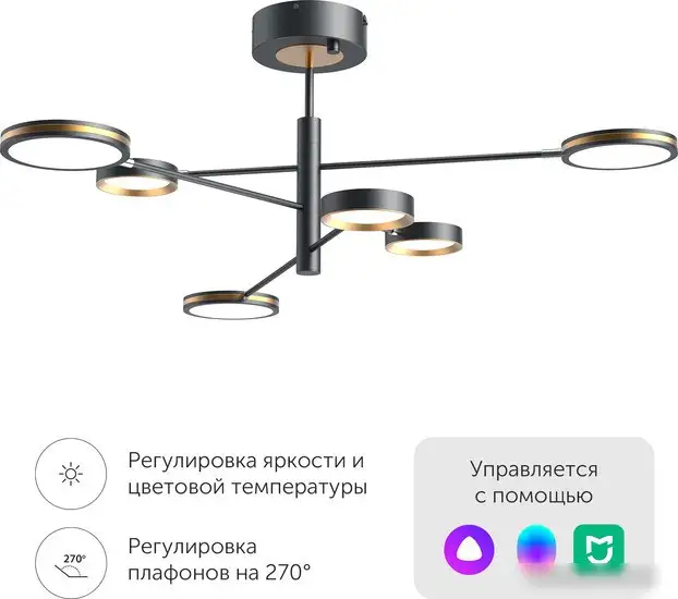 Люстра средней высоты Yeelight Arowana Chandelier C2103 имеет современный дизайн и легко вписывается в любой интерьер. Она крепится к потолку и оснащена шестью плафонами с золотистым и черным цветом, создающими стильный вид. В светильнике встроены светодиоды мощностью 60 Вт, которые обеспечивают яркое и энергоэффективное освещение. Вы можете управлять люстрой с помощью смартфона или голосом, подключившись к приложению Xiaomi Mi Home или фирменному приложению. Люстра позволяет регулировать яркость и цветовую температуру светопередачи — от теплого до холодного света, что создает комфортную атмосферу. Каркас и плафоны изготовлены из металла, что гарантирует долговечность. Параметры длина и ширина составляют по 105.5 см, а высота — 43.5 см, что подходит для различных потолков. Люстра легко монтируется на планке и не включает выключатель, по этому управлению сегмент — с помощью гаджета или голосовых команд.