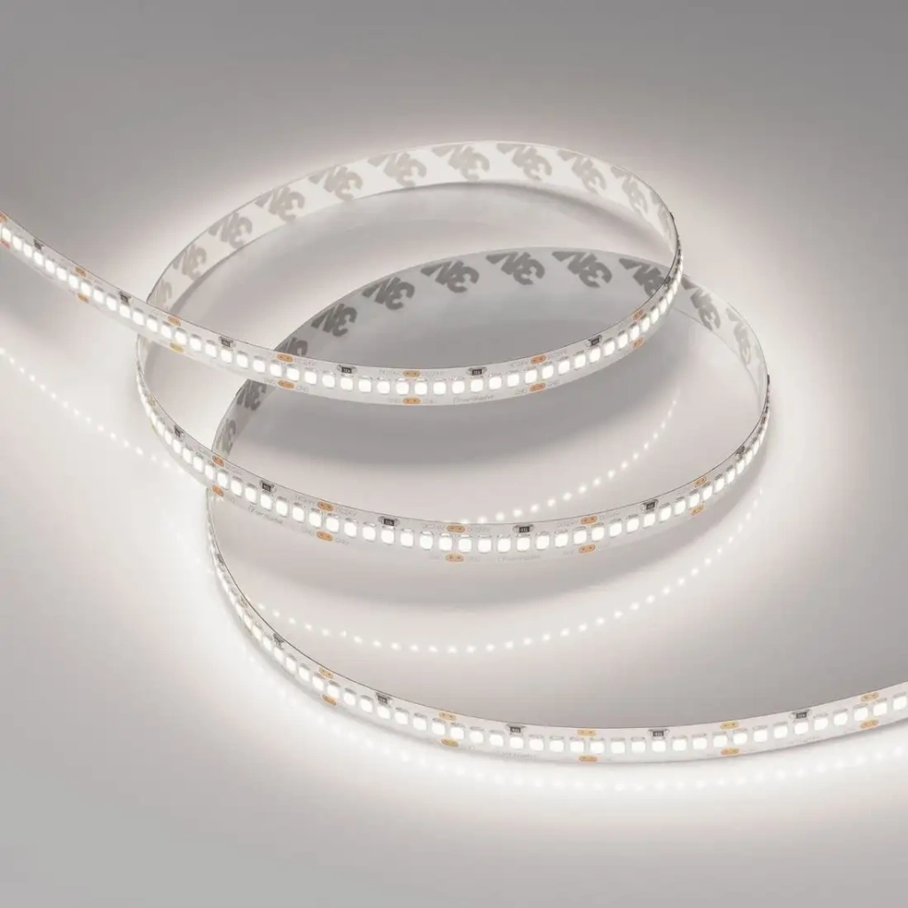 Эта светодиодная лента Arlight отлично подходит для создания яркого и равномерного освещения. Она имеет длину 5 метров и состоит из 252 светодиодов типа 2835 на каждый метр, что обеспечивает высокий световой поток — 1590 люмен на метр. Лента работает на напряжении 24 В, потребляя всего 11 Вт на метр, что позволяет снизить энергопотребление. Благодаря белому цвету свечения и цветовой температуре около 5000 К, она создает приятный дневной свет. Лента выполнена в открытом исполнении с шириной 10 мм и высотой 1.5 мм, что облегчает монтаж. Она имеет степень защиты IP20, поэтому не предназначена для влажных условий. Высокий индекс цветопередачи CRI 85 передает цвета максимально естественно, а узкий угол рассеивания 120° обеспечивает яркое и сфокусированное освещение. Лента управляется одним каналом, что делает её удобной для интеграции в различные системы освещения.