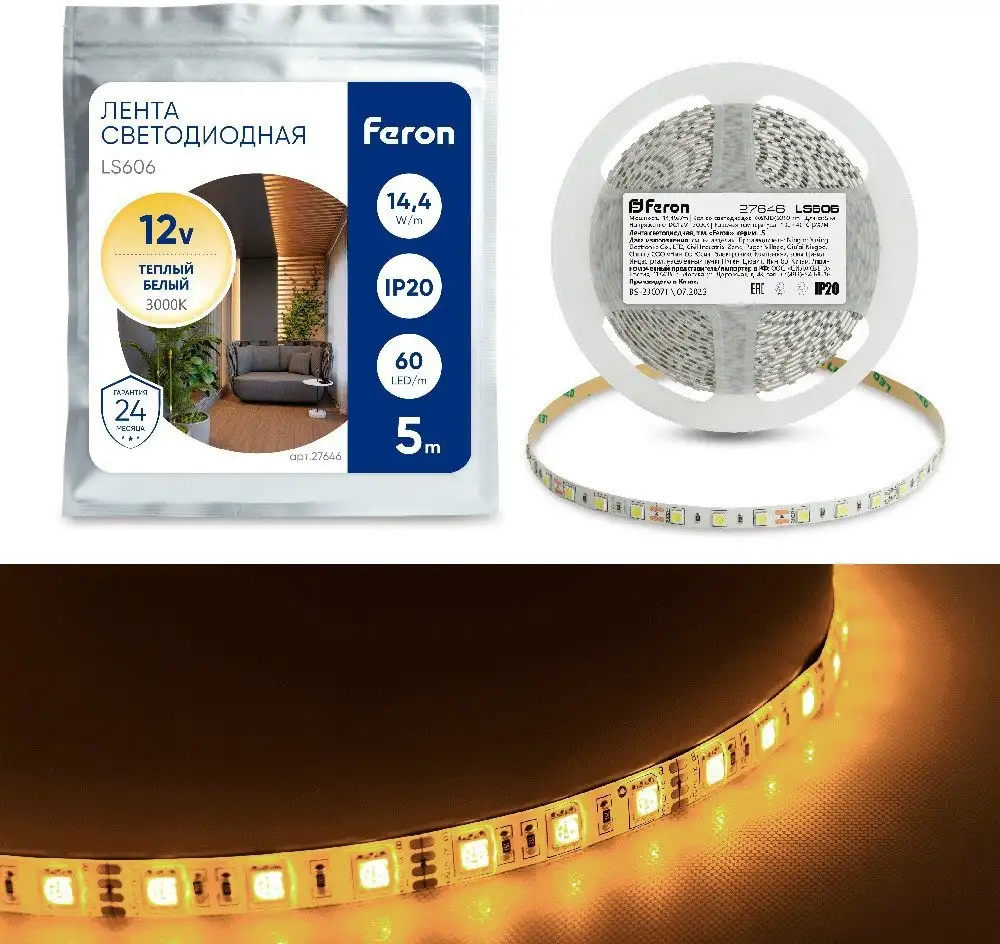 Эта светодиодная лента Feron LS606 — отличный выбор для создания мягкого теплого света в любом помещении. Она длиной 5 метров и имеет ширину всего 10 мм, что позволяет легко установить её в любую часть интерьера. Светодиоды типа 5050 создают яркое освещение с цветовой температурой 3000 К, приближающейся к естественному теплому свету. Лента оснащена 60 светодиодами на метр, которые обеспечивают общий световой поток 1200 люмен. Работает она на напряжении 12 В и потребляет 14.4 Вт/м, что помогает снизить энергопотребление. Степень защиты IP20 защищает от пыли, но не подходит для влажных помещений. Лента легко резается через каждые 50 мм, что позволяет адаптировать длину под разные нужды. Благодаря липкой основе установка становится очень простой и быстрой. Эта светодиодная лента идеально подходит для подсветки мебели, стен или витрин.