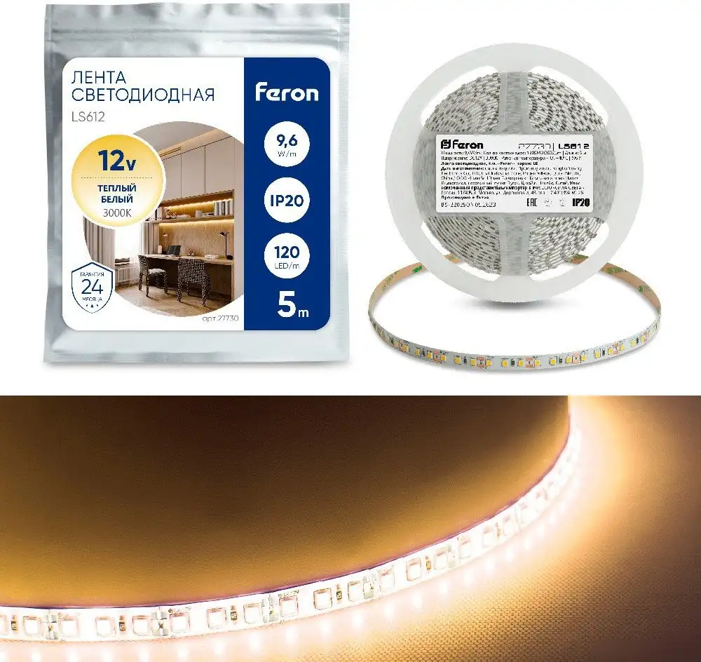 Для создания уютной атмосферы или подсветки помещений подойдет светодиодная лента Feron LS612 27730. Она выполнена из светодиодов типа 2835, которые обеспечивают яркое теплое белое освещение с цветовой температурой 3000 К. Лента работает от напряжения 12 В и потребляет 9.6 Вт на метр, что делает её энергоэффективной. Длина ленты составляет 5 метров, ее легко можно укоротить до минимального отрезка 25 мм, что удобно при установке. Благодаря ширине 8 мм и небольшому размеру высоты 1.22 мм, она легко вписывается в любые интерьеры. Световой поток достигает 1100 лм/м, чем обеспечивается насыщенное освещение. Лента обладает индексом цветопередачи 80, что гарантирует естественные цвета предметов. Однако, она не защищена от влаги (IP20), поэтому ее лучше использовать внутри помещений.