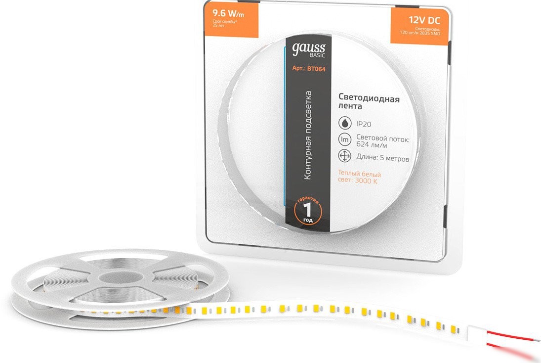 Гаусс BT064 — это светодиодная лента длиной 5 метров, которая создает теплый белый свет с цветовой температурой 3000 К. Она работает при напряжении 12 В и имеет мощность 9,6 Вт на метр. Лента состоит из 120 светодиодов 2835 на каждый метр, обеспечивая яркий и равномерный свет — 624 люмена на метр. Ее ширина всего 8 мм, а прозрачная основа делает установку простой и аккуратной. Благодаря высокой цветопередаче (CRI 89) она хорошо передает цвета предметов вокруг. Лента выполнена в открытом исполнении и защищена от влаги только классом IP20, что подходит для внутренних помещений. Ее легко укоротить: минимальный отрезок — 50 мм, и она прочно фиксируется к поверхности благодаря клеящей основе. Угол рассеивания света — 120°, что обеспечивает равномерное освещение. Этот девайс идеально подходит для декоративного освещения дома и в офисе.