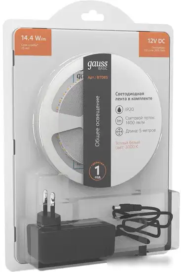Готовый комплект светодиодной ленты Gauss LED 2835/120 12V 14,4W/m 1400lm/m 3000K 8mm IP20 5m 1/50 BT085