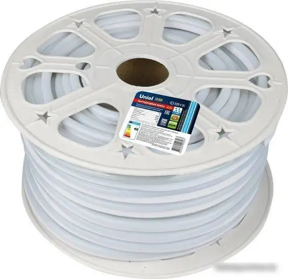 Гибкий неон Uniel ULS-N21-2835-120LED/m-8mm-IP67-220V-8W/m-50M-BLUE отлично подходит для яркого и равномерного освещения. Он выполнен из герметичного материала, что защищает от влаги и делает его устойчивым к внешним условиям. Светодиоды типа 2835 обеспечивают яркое синее свечение с углом рассеивания 60°. Лента имеет длину 50 метров и может легко изгибаться для создания различных световых эффектов. Мощность 8 Вт на метр позволяет экономить электроэнергию. Простая установка без разъема обеспечивает надежное соединение. Благодаря высокой степени защиты IP67, неон подойдет для использования как внутри помещений, так и на улице. Он не требует дополнительных специальных условий эксплуатации, что облегчает монтаж и обслуживание. Этот неон отлично подойдет для декоративного освещения, оформления фасадов и коммерческих пространств.