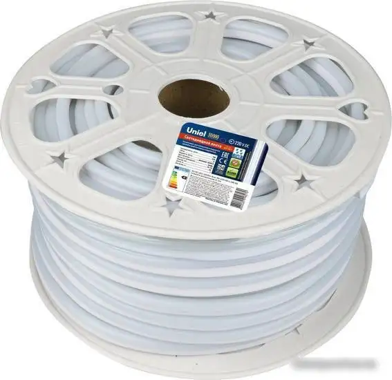 Гибкий неон Uniel ULS-N21-2835-120LED/m-8mm-IP67-220V-8W/m-50M-DW создаёт яркое холодное белое свечение, отлично подходящее для оформления интерьеров и экстерьеров. Он работает при напряжении 220 В и рассчитан на мощность 8 Вт на метр, что обеспечивает хорошую яркость при низком потреблении энергии. Лента выполнена герметичной по стандарту IP67, что позволяет использовать её на улице и в условиях высокой влажности. В ней там 120 светодиодов на метр, которые равномерно распределены под углом 60°, создавая мягкое и равномерное освещение. Общая длина ленты составляет 50 метров — её можно безопасно использовать для больших площадей или соединять для нужной длины. В конструкции отсутствует разъем подключения, требующий самостоятельной установки и соединения. Лента изготавливается из гибкого материала, что позволяет легко монтировать её на любые поверхности. Благодаря высокой влагозащищенности и хорошему качеству светодиодов, она прослужит долго, не боясь влаги и перепадов температуры.