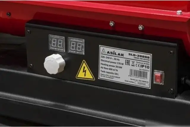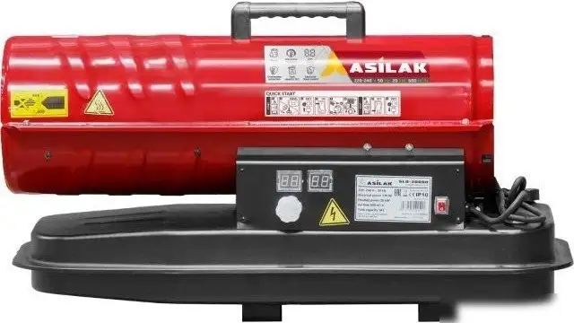 Дизельная тепловая пушка Asilak SLD-20000 из Китая предназначена для быстрого и эффективного нагрева помещений. Ее мощность составляет 20 кВт, что позволяет обогреть до 600 кубических метров воздуха за час. Тепловая пушка работает на дизельном топливе и имеет расход около 1,66 литров в час. В емкости бака помещается 18 литров топлива, что обеспечивает длительный режим работы. Устройство оборудовано термостатом и системой защитного отключения при перегреве или утечке топлива, что делает его безопасным в использовании. Ее размеры — 760 мм в длину, 310 мм в ширину и 415 мм в высоту, вес — всего 15 кг, что облегчает транспортировку и установку. Красный цвет и пыле- и влагозащита IPX4 делают её удобной для работы в различных условиях.