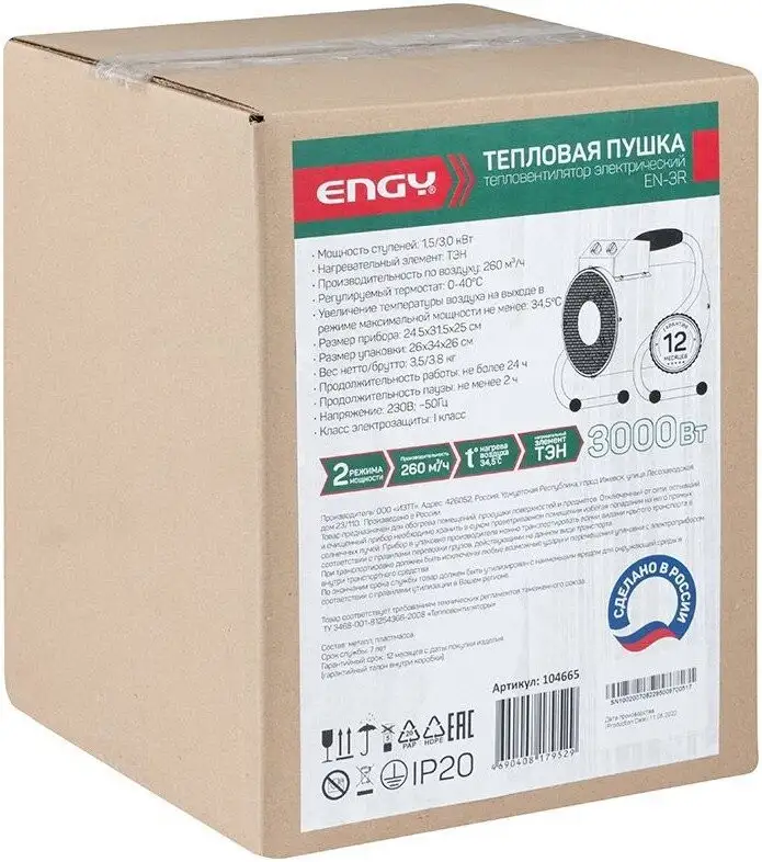 Электрическая тепловая пушка Engy EN-3R обеспечивает мощность от 1,5 до 3 кВт и хорошую производительность — до 260 м3/час. Она работает на электрике и легко подключается к стандартной сети 230 В. Пушка имеет две ступени мощности, которыми можно регулировать тепло в помещении. Встроенный термостат помогает поддерживать комфортную температуру, а защита от перегрева снизит риск поломки. Устройство защищено от пыли и влаги по стандарту IP20, что подходит для использования внутри помещений. Вес пушки — всего 3,8 кг, а размеры позволяют легко ее переносить и хранить. Цвет корпуса — желтый с черным, что делает устройство заметным и стильным. Пушка предназначена для быстрого прогрева небольших помещений или отдельных зон. Легкий механизм регулировки и компактные размеры делают её удобной в использовании и хранении.