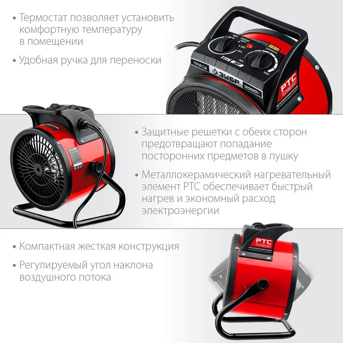 Электрическая тепловая пушка Зубр Мастер ТПК-3Р предназначена для обогрева помещений. Она работает от сети с напряжением 230 В и имеет мощность от 1,6 до 3,2 кВт, что позволяет регулировать тепло в зависимости от потребности. Устройство обеспечивает производительность до 300 м³ в час, быстро прогревая пространство. Тепловая пушка оборудована двумя ступенями мощности и термостатом, что помогает поддерживать комфортную температуру. За безопасностью следит система защитного отключения при перегреве. Корпус выполнен в красно-черных цветах и имеет степень защиты IP20, что исключает попадание пыли. Размеры компактные, а вес всего 2,2 кг позволяют легко перемещать устройство. Технология гарантирует надежную работу и безопасное использование в доме или на работе.