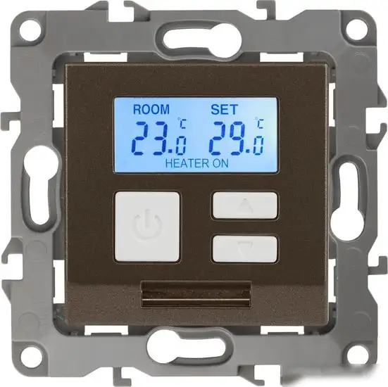 непрограммируемый, кнопочное управление, экран, датчик температуры воздуха, монтаж скрытый (внутренний), корпус IP20