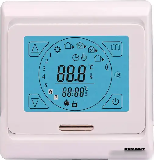 Терморегулятор Rexant 51-0533 — это устройство для системы "Умный дом", которое позволяет удобно управлять отоплением. Он имеет сенсорный графический монохромный экран с подсветкой, что облегчает настройку и контроль. Терморегулятор оснащён датчиками температуры воздуха и пола, чтобы точно поддерживать комфортную температуру в помещении. Его можно монтировать накладным способом снаружи стены. Устройство имеет энергонезависимые часы и позволяет устанавливать до шести интервалов температуры в день, чтобы автоматизировать отопление. Также есть функция защиты от замерзания, которая предохраняет помещение от переохлаждения. Пользователи оценят простоту использования и расширенные программные возможности этого терморегулятора.