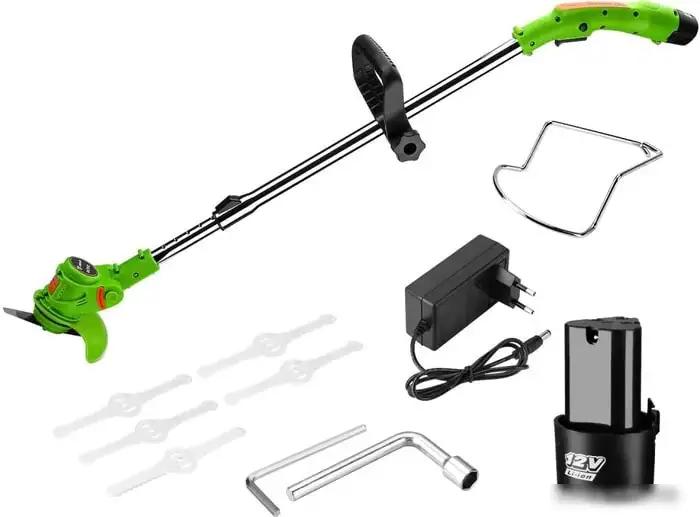 Триммер Deko DKTR12 — удобный инструмент для ухода за газоном и кустарниками. Он работает на аккумуляторах напряжением 12 В, что обеспечивает свободу движений без проводов. Тример оснащен металлическим и пластиковым ножами, которые позволяют быстро и точно стричь траву и зелень. Ширина скашивания составляет 14 см, а телескопическая штанга с регулируемым углом наклона помогает достигать труднодоступных участков. Верхнее расположение двигателя делает устройство сбалансированным и легким в управлении. В комплект входят два аккумулятора, что позволяет продолжительно работать без перерыва, и зарядное устройство для быстрого подзаряда. Также в наборе есть разные пластиковые и металлические лезвия, что расширяет возможности использования. Вес устройства всего 1.56 кг, оно удобно в использовании и не утомляет руки. Триммер легко собирается и регулируется под ваш рост и работу. Благодаря компактной конструкции и легкому весу, он отлично подходит для домашнего ухода за участком.