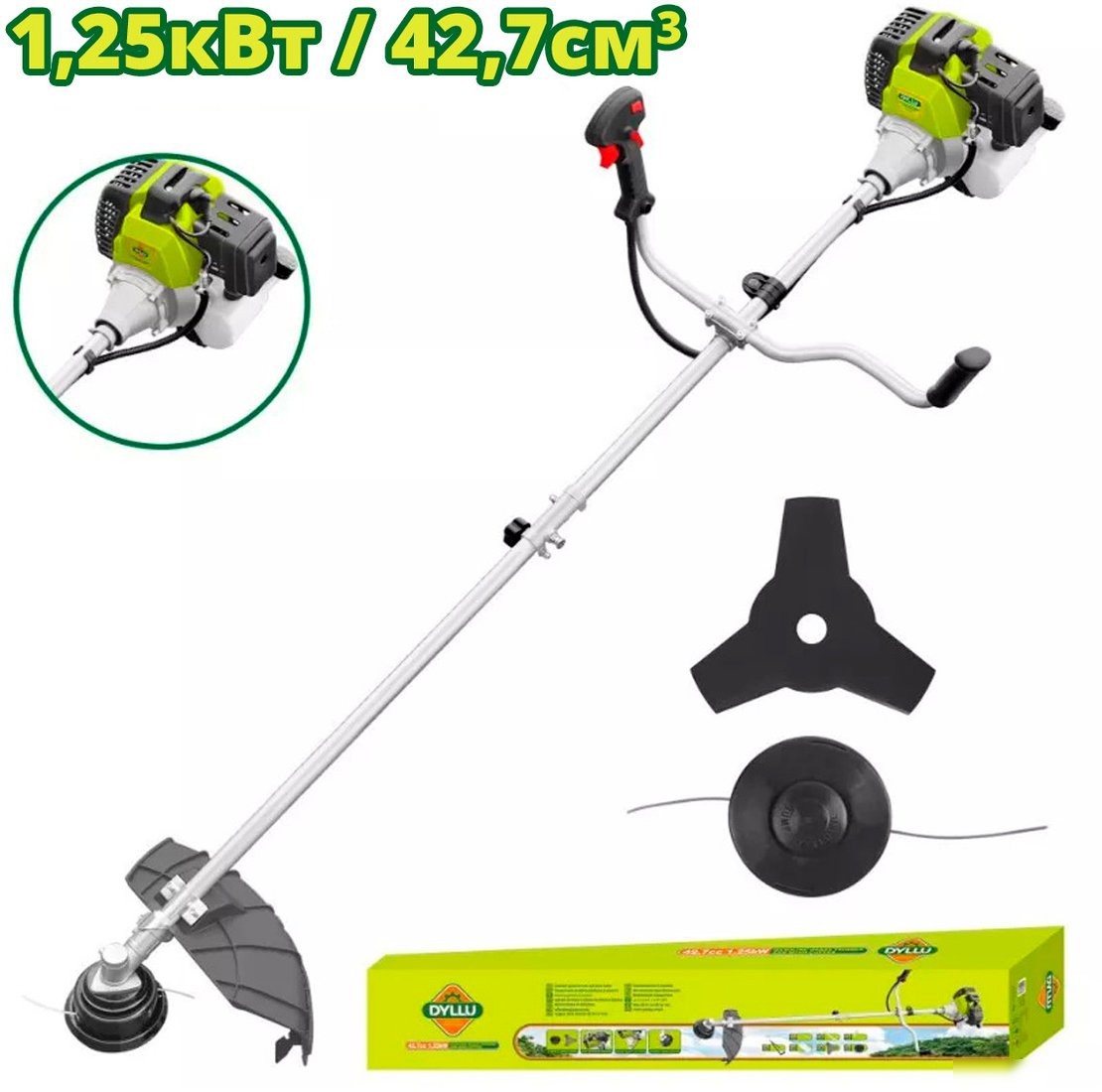 Триммер Dyllu DTGM2543 — это мощный инструмент для ухода за газоном и кустами. Он работает на бензиновом двигателе мощностью 1250 Вт и имеет две насадки: леску и металлический нож, что делает его универсальным. Ширина скашивания регулируется в диапазоне от 25,5 до 42 см, что помогает быстро обработать большую площадь. Благодаря плечевому ремню и верхнему расположению двигателя, использование триммера удобно и не устаешь. Он оснащен полуавтоматической подачей лески, что облегчает работу. В комплект входит триммер, насадки, ремень и удобная коробка для хранения. Этот триммер поможет быстро и качественно подстричь траву и кусты в любом саду.