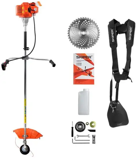 Триммер Skiper GTP2101 предназначен для ухода за газонами и кустарниками. Он оснащен бензиновым двухтактным двигателем мощностью 2100 Вт и рабочим объемом 43 см³, что обеспечивает хорошую производительность. Ширина скашивания регулируется от 25,4 до 43 см, позволяя выбрать подходящий режим работы. Триммер легко запускается благодаря системе легкого пуска и работает на топливе в баке объемом 1,2 литра. В комплект входят косильная головка, пильный диск и ремень для удобной работы. Расположение двигателя — верхнее, что упрощает обслуживание и баланс устройства. Благодаря сменным насадкам устройство универсально и подходит для разных задач. Вес триммера составляет 8,1 кг, что обеспечивает достаточно устойчивость при работе. Ременная оснастка помогает равномерно распределить нагрузку и снизить усталость пользователя.