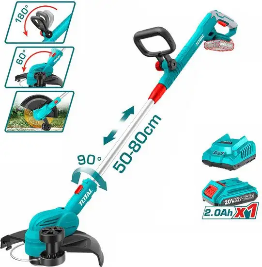 Триммер Total TGTLI203285 работает на аккумуляторе и легко справляется с косицами травы и кустов. Он оснащён мощным бесщеточным двигателем, который обеспечивает долгий срок службы и эффективность. Ширина скашивания составляет 30 см, что позволяет быстро обрабатывать большие участки. Телескопическая штанга регулируется по высоте и наклону, чтобы удобно работать в разных положениях. В комплект входит аккумулятор ёмкостью 2 А·ч и зарядное устройство, что делает работу автономной и удобной. Триммер имеет в рабочем положении небольшую массу — 2.8 кг, что облегчает его использование. Для дополнительного комфорта есть колеса, а леска диаметром 1.6 мм подходит для различных задач. Простая конструкция и наличие насадки с леской позволяют легко заменить рабочий инструмент. Используйте этот триммер для поддержания чистоты на участке без лишних усилий.