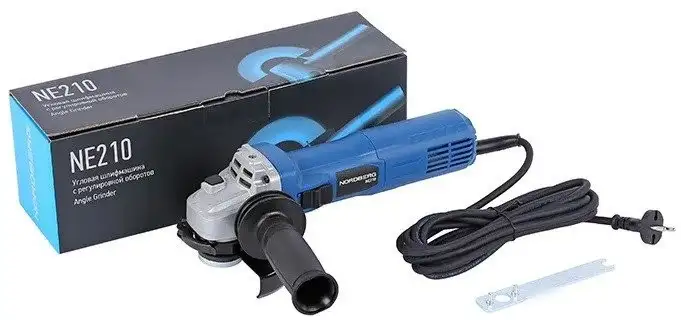 Nordberg NE210 — это угловая шлифмашина с мощностью 1020 Вт, которая отлично подходит для различных ремонтных и строительных работ. Она работает на сеть и имеет диаметр диска 125 мм, что делает её удобной для обработки разных поверхностей. Машина весит всего 2 кг, благодаря чему ее легко держать и маневрировать. В комплекте есть боковая рукоятка для лучшей устойчивости и защитный кожух для безопасной работы. Устройство не имеет регулируемой скорости или функции остановки при заклинивании, но простое в использовании и надежное. Дополнительно к ней идут ключ для зажимной гайки и паспорт-инструкция.