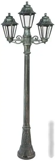 Фонарный столб Fumagalli Artu/Anna E22.158.S21.BXF1R создает яркое и теплое освещение с цветовой температурой 2700 K. Он оборудован тремя лампами мощностью 60 Вт каждая, которые обеспечивают световой поток 800 лм. Каркас и плафоны выполнены из металла, стекла и пластика в бронзовом цвете, что придает классический стиль. Столб легко монтировать благодаря простым размерам и весу 12 кг. Защита IP44 защищает от влаги, что подходит для уличного использования. В комплекте идут лампочки, которые можно заменить на светодиодные или накаливания.