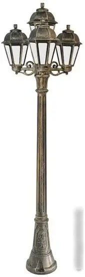 Фонарный столб Fumagalli Artu Bisso/Saba K22.158.S31.BXF1R выглядит стильно и отлично подходит для освещения дворов и улиц. Он оснащён четырьмя лампами мощностью 60 Вт, которые создают яркий свет с потоком 800 люмен и цветовой температурой 2700 К — такого света достаточно для комфортного времяпрепровождения. Каркас и плафоны выполнены из бронзового металла и стекла, что придаёт изделию классический и приятный внешний вид. Светильник легко монтировать благодаря простому монтажу и прочному алюминиевому каркасу. Он защищён от влаги по стандарту IP44, что делает его устойчивым к дождю и пыли. Лампы можно заменить на светодиодные или лампочки накаливания, так как есть цоколь E27 и в комплекте уже идут лампы. Размеры изделия — 56х56х198 см, а вес — около 12 кг. Этот столб хорошо подходит для уличного освещения и долговечен в использовании.