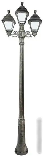 Фонарный столб Fumagalli Cefa U23.157.S21.BYF1R отлично подходит для освещения улиц. Он оснащён тремя светодиодными лампами мощностью по 60 Вт, каждая из которых обеспечивает яркий световой поток в 800 люмен. Каркас выполнен из прочного пластика с бронзовой окраской, а плафоны — из стекла в классическом стиле. Столб имеет белые абажуры и объединяет стильный дизайн с высокой функциональностью. Он легко монтируется и подходит для разных территорий благодаря размерам: 82 см ширины и 255 см высоты. Влагозащищённость сертификатом IP55 защищает устройство от воды и пыли. В комплект входит лампочка, что позволяет сразу установить и начать использовать. Столб обладает надёжной конструкцией, способной выдерживать погодные условия.