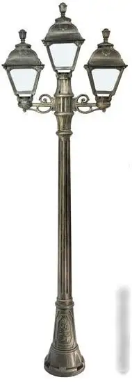 Фонарный столб Fumagalli Cefa U23.158.S21.BYF1R обеспечивает яркое освещение с помощью трёх светодиодных ламп мощностью по 60 Вт каждая. Он выполнен в классическом стиле с белыми абажурами и бронзовым каркасом, что отлично впишется в любой внешний дизайн. Столб обладает высоким уровнем влагозащиты IP55, что позволяет использовать его во влажных условиях без опасений. Каркас изготовлен из прочного пластика, а плафоны выполнены из стекла, что обеспечивает долговечность и устойчивость к погодным условиям. Световой поток достигает 800 люмен, обеспечивая хорошую видимость на улице. Высота 205 см и ширина 82 см дают просторный и привлекательный внешний вид. В комплект входит лампочка, что делает монтаж простым и удобным. Эффективные светодиодные лампы позволяют снизить энергопотребление и продлить срок службы фонаря. Этот уличный фонарь легко устанавливается и служит надежным источником света на улице.