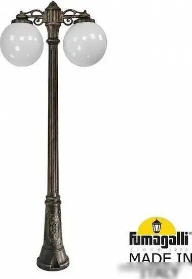 Городской фонарь Fumagalli Globe 300 FU_G30.156.S20.BYF1RDN выполнен в классическом бронзовом цвете и обладает прочным пластиковым каркасом с стеклянными плафонами. Он оснащён двумя лампами мощностью по 75 Вт, которые легко заменяются и обеспечивают яркий светильник с общим световым потоком 1600 люмен. Фонарь использует цоколь E27 и идут в комплекте с энергоэффективной филаментной LED-лампой яркостью 800 лм. Благодаря степени влагозащиты IP55, он устойчив к погодным условиям и влажности. Размеры устройства: ширина 72 см, высота 185 см, вес 12 кг. Фонарь предназначен для городской улицы, он не поворачивается, но обеспечивает стабильное освещение. Его дизайн подходит для уличных пространств, создавая уют и безопасность ночью.