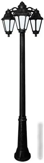 Фонарный столб Fumagalli Ricu Bisso/Anna E22.157.S30.AYF1RDN изготовлен из металла и пластика и подходит для уличного освещения. Он оснащён тремя лампами мощностью 60 Вт, которые обеспечивают яркий свет — 800 люмен при цветовой температуре 2700 K. Каркас и плафоны выполнены в классическом чёрном цвете, а плафоны из стекла добавляют эстетике. Столб имеет повышенную влагозащищённость — класс IP44, что защищает его от дождя и влаги. Он легко монтируется и устойчив благодаря своим размерам: 61х61х213 см и весит около 16 кг. В комплект входит лампочка, а поддержка светодиодных ламп позволяет снизить расход энергии. Надёжность конструкции и стильный дизайн делают его хорошим выбором для улицы. Благодаря высоким стандартам защиты и высоким качествам материалов, он прослужит долго. Этот фонарный столб отлично подходит для освещения дорожек, парков и дворов.
