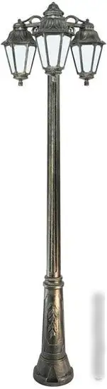 Фонарный столб Fumagalli Ricu Bisso/Anna E22.157.S30.BYF1RDN выполнен в классическом стиле с бронзовым каркасом и плафонами из стекла. Он оснащён тремя лампами мощностью 60 Вт каждая, которые создают яркий световой поток 800 лм при цветовой температуре 2700 K. В столбе используются лампы типа накаливания или светодиоды, а лампочки идут в комплекте. Он устойчив к влаге благодаря степени защиты IP44, что подходит для уличного использования. Каркас сделан из металла и пластика, а плафоны — из стекла. Размеры составляют 61 см по длине и ширине, а высота — 213 см. Весит около 16 кг, что обеспечивает стабильность и надёжность. Этот фонарь легко монтировать и он отлично смотрится на улице или на входе в дом.