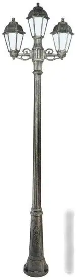 Фонарный столб Fumagalli Ricu Bisso/Saba K22.157.S21.BYF1R — надежное освещение для улицы с тремя лампочками мощностью 60 Вт. Он выполнен из металла и пластика в классическом бронзовом цвете, что хорошо сочетается с любым дизайном. Столб обеспечивает яркий световой поток в 800 люмен при цветовой температуре 2700 К, создавая уютную атмосферу. Благодаря крепкому стеклянному плафону и повышенной влагозащищенности IP44, он устойчив к погодным условиям. В комплект входит лампа, и можно использовать как накаливания, так и светодиодные лампочки через цоколь E27. Высотой почти 2,5 метра, он легко устанавливается и надежно освещает придомовую территорию. Каркас сделан из прочного металла, а плафон из стекла, что обеспечивает долговечность. Вес около 16 кг делает монтаж стабильным и безопасным.