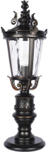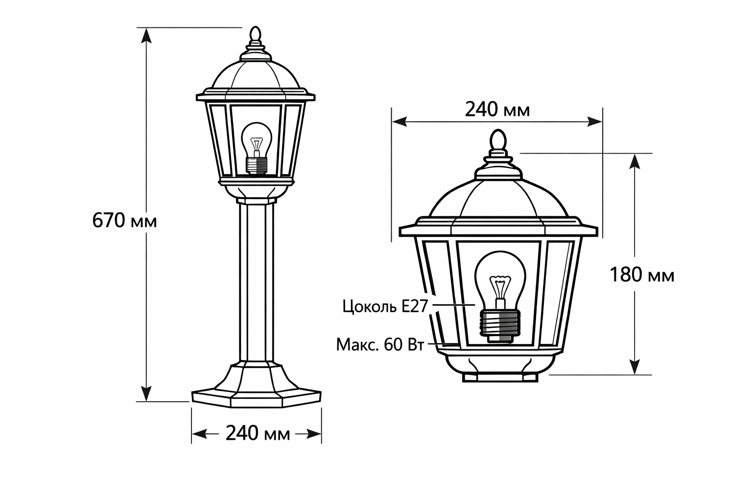 60 Вт, 1 лампа, цоколь E27, поддержка ламп накаливания, люминесцентных и светодиодных, питание от сети 220 В (розетка), степень защиты IP55, металлический корпус, стеклянный прозрачный плафон, бронзовый цвет каркаса, уличное исполнение, высота 67 см, размеры 24×24 см, вес 3,72 кг, без датчика движения, без датчика освещённости, без пульта ДУ, стационарная установка.